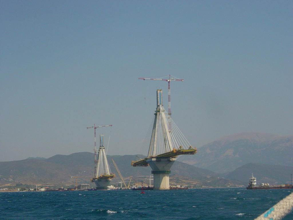 Bridge under construction Trizonia is a most attractive island with a small village and partly developed marina. We found a place on the outer mole that was a bit exposed to the fresh afternoon breeze but we enjoyed a good meal ashore in a very simple taverna. Galaxidi, some 20 miles to the east is rather more sophisticated but we had a bit of trouble with ballast just off the quay and had to climb ashore via Gold Lady, owned and sailed by a redoubtable Dutch woman. Itea is less than 5 miles away, a plain sort of town and one of many Greek places with a part finished marina. We liked it there and noted the presence of Hosanna with Bill and Laurel Cooper the noted Sell up and Sail writers. We passed a very pleasant hour with our Dutch neighbour from Galaxidi and her friend who had come to join her for a holiday. These ladies have been keen hockey players most of their lives and one is still an active team member at 63. Margaret suffered a pang of regret that she no longer plays. They were delightful people but their energy was somewhat tiring. Apparently the boat was called Old Lady when our new friend bought her. We could well understand why she had changed the name. Our next stop was in a quiet bay, Ormos Vathi, from where we made the short hop across the end of the gulf to Corinth. The town did not appear to have much going for it as a cruising destination but some South African yachtsmen were helpful and interesting. Traversing the Corinth canal was an experience to be undertaken at least once. Shipping was subject to strict traffic management. Once again we were fortunate because we suffered very little delay before being given permission to take our place in the east going convoy whereas waits of two to three hours are not uncommon at busy times. We paid our dues in the control station at the east end of the canal where I am ashamed to say that I chickened out of telling the officials that they were flying the Union Flag upside down.