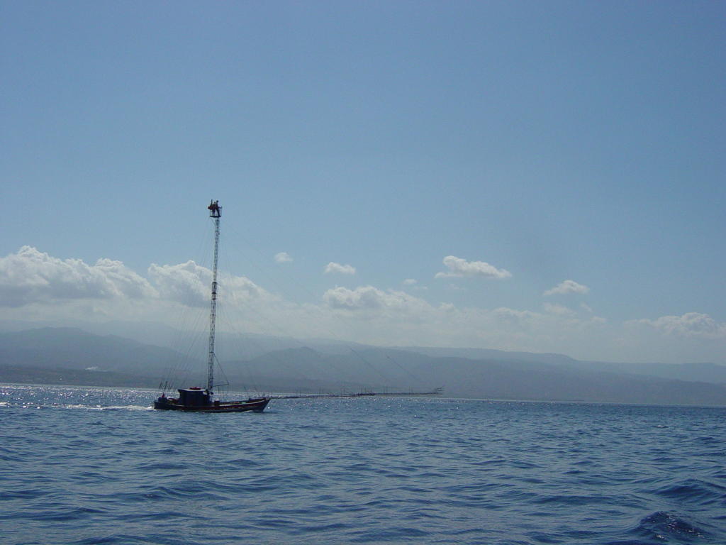 Anchored off the pretty village of Cefalu On leaving Messina, and needing fuel, we retraced our steps for a mile to the north where we found the concrete fuel jetty used by the strait pilots and swordfishing boats. The jetty stands out into one of the few tidal streams in the Mediterranean and extends from a petrol station on the shore. The young man in charge was happier serving Italian motorists. He shouted directions for tying up across the stream which I knew were not best practice but, faced with authority shouting loudly I complied. In the end it was an awful struggle heaving and winching on the warps but, no harm done and I vowed to have the courage of my own convictions in future. The swordfishing boats are a local phenomenon. They have tall lattice masts with a crows nest for the skipper to spot fish and con the boat from and a huge bowsprit, up to 15 metres long, to allow the harpoon man to get close to the prey before he is frightened by the approaching boat (see photograph). According to Heikell the poor swordfish take a siesta like everything else in this part of the world and they are spotted and caught before they realize what's hit them. The boats charge about in an apparently random manner and one seems in imminent danger of receiving a bowsprit through a porthole.
